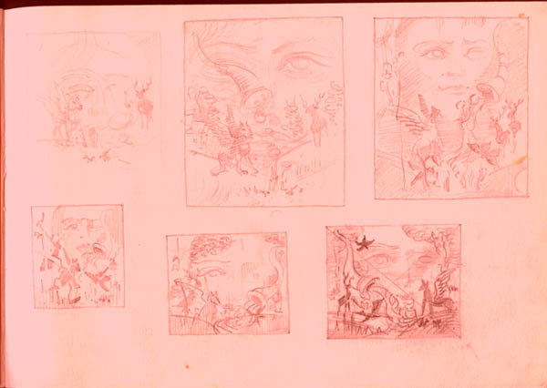 А ниже – эскизы и окончательный вариант работы «Даждьбог» (бог добра и светя у восточных славян, культурный герой и первопредок). Длинные сосны изначально располагались с левой стороны, но так они закрывали вход в картину, и я перенес их вправо. Фактически, здесь присутствуют две группы: малая (человек, костер кривая сосна) и большая (Даждьбог и две сосны).