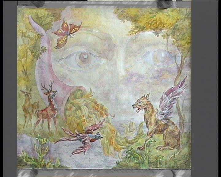 Следующие две картинки иллюстрируют процесс выбора композиционного решения для выражения образа великой женской богини восточных славян – Макоши. Сама схема навеяна рисунком на целлофановом пакете (там были огромные два глаза и маленькие птички по их периметру).