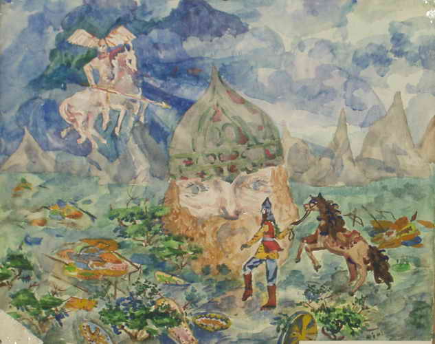 "Богатырь Руслан и царь Огненный щит". Гребнева Маша (акварель).