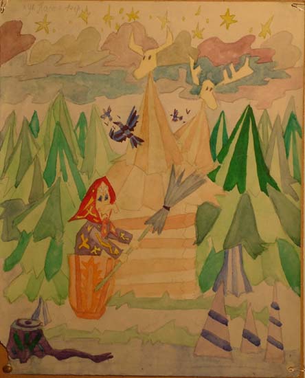 Перед работой учитель проводит беседу о русских сказках, показывает репродукции с картин Васнецова, Билибина и др. художников. Следует рассказать обучаемым об основных персонажах, их атрибутике, с какими явлениями жизни они связывались в представлении людей.