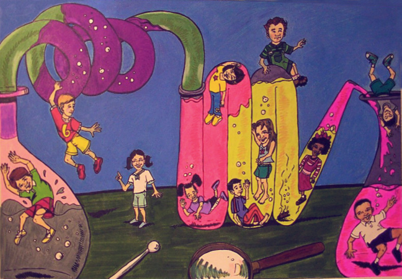 Institutional Illustration titled: "Fun With Chemistry" Rendered on 2 ply Illustration board using mixed media(Watercolour, Colour Pencil, and Colour Marker) © 2002 17x24