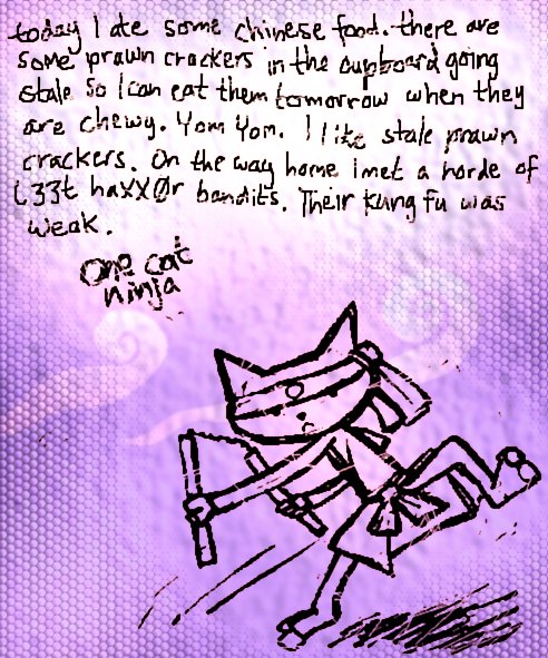 This is the first of the four in the series, and the simplest. It was the first drawing of the character, so it served mostly as an intro, letting the reader know that ocn is a prawn cracker lovin', kung-fu fightin' badcat extraordinaire.