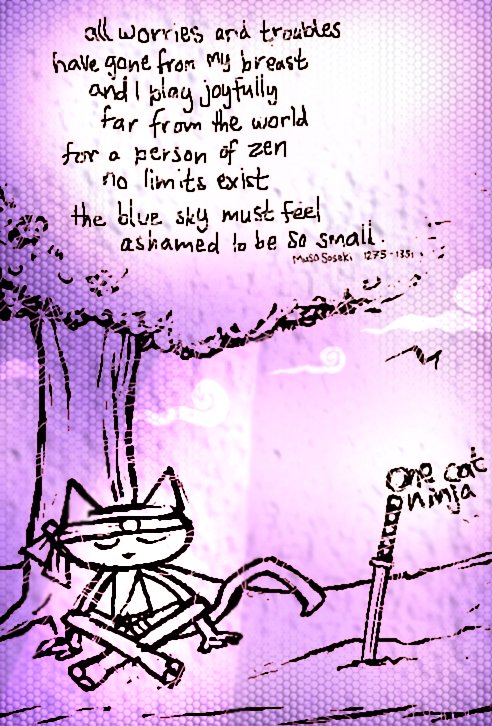 Further to ocn's snack eating / bandit scrapping, I felt I should reveal his gentler, more buddhist side. The text is from my favourite Zen poem by Muso Soseki, a Zen Master of the 13th - 14th Century.
