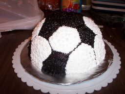 ![]() Soccer Ball cake This cake was done in a large glass measuring cup...since I didn't have the ball pan. I used chocolate fudge icing as a base for the black icing. |