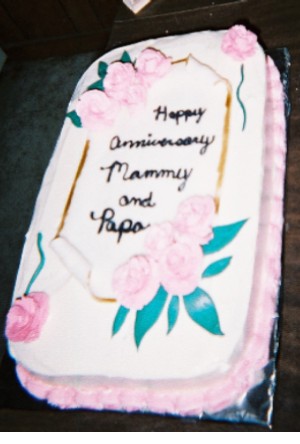 ![]() Anniversary Cake! This cake was a 9x 13 cake. The "scroll" and the leaves were made of fondant. The roses were buttercream. |