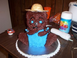 ![]() Bear Cake This cake was the stand up bear pan decorated in whipped cream icing with overalls on. The hat came from the craft section of Walmart. I put a little saran wrap under it to keep it out of the icing. |