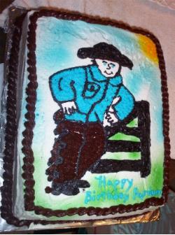 ![]() Cowboy Cake This cake was a 11x15 sheet cake with a buttercream transfer....that didn't work..I did it wrong so I ended up freehanding it...not my best work but the little boy I made it for refused to cut it....lol so that made me feel lots better :) |