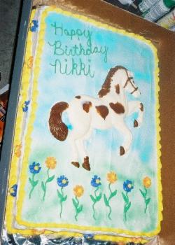 ![]() Horse This cake was 2 11"x15" cakes side by side. It was done in 4 flavors. The horse was made completly from chocolate. I used a "pantastic" horse pan for a mold. |