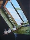 Each year we?ve lived here in northern Arizona, we?ve had a group of swallows come to nest under the overhangs of our roof on any little ledge they can balance on. Actually they build in the exact place they nested the year before?.even when we?ve prayed the nests down in the Fall. They are really cute little birds, about the size of a sparrow, but thinner, with flitting, swoopy flight patterns and adept balancing acts as they build their nests each year with mouthful by mouthful of mud, sticks of grass too. The have these very expressive faces and heads and I am always in awe of their cute little shoulders?they are the only bird I know of that has shoulders. I almost expect them to shrug at me when they cock their heads, wishing I?d leave the porch. Every year I think aloud to my husband, ?We should knock those nests down before they lay their eggs.? Before you think I?m cruel, I will tell you the reason.
