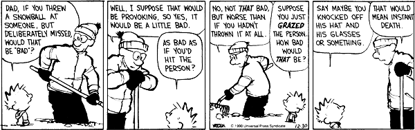 By the way, just because I want to doesn’t mean I do….nor does it mean I don’t. *doing a little word dance* It depends on the circumstance….and the consequence. Situational ethics creep in like in the Calvin and Hobbes comic strip above. I am not sure if all personality types have that constant struggle, but mine is prone to be lacsadasical, at best, about rules. (I’ve even been know to call them suggestions.) It is ridiculous, but I’m prone to rebellious feelings and curiosity that would have killed the cat like a slam dunk. Maybe this is what Paul was talking about in Romans 7:19-21. It is a very real struggle between our sin nature and the Holy Spirit.
