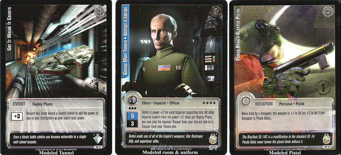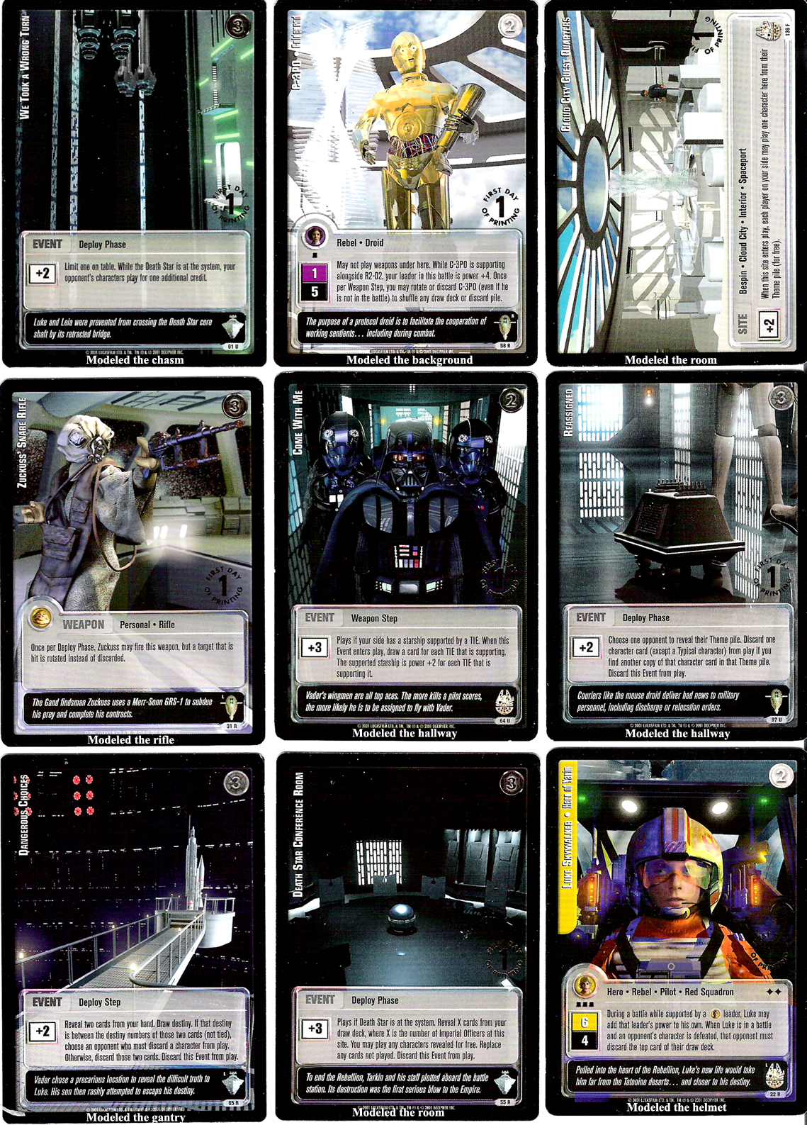 From 2000-2001 I had the opportunity to work as a freelance modeler doing Star Wars art for a Trading Card Game called Jedi Knights, conceived and released by Decipher, Inc. I scanned the cards myself, they're not in the best condition. Each card is notated with what I contributed, I did the modeling on a low-end modeler called SoftFX Pro and Decipher did the rendering on Maya.