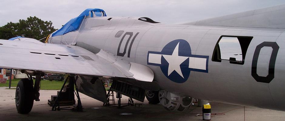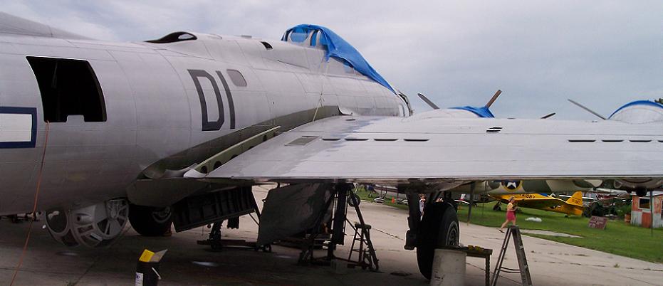 This is the B-17G "Liberty Belle." She is being restored by Tom Reilly's Flying Tigers Warbird Restorations in Kissimmee, Florida. It's serial number is 44-85813. It is painted in the colors of the 390th bomb group. This is the same restoration experts that restored the Lockheed P-38F "Glacier Girl." This is the only F model flying in the world! This particular B-17 served as an Air Force test bed for a variety of engines that were installed in the nose of the plane. It tested both turboprop and a R-3350 propeller design. In 1980 it crashed while flying as an air tanker on a firebombing mission. The aircraft was acquired by Flying Tigers Restoration after it had been destroyed again during a tornado. This airplane was built in large part using the original parts as patterns and custom fabricating new parts from that. All the sheet metal on the airplane is new. There's over 1,000,000 rivets in the skin which cost $1.00 a piece. That means this plane has over $1,000,000 in rivets alone! The plane is painted and is finishing up restoration to begin flight testing in early August. After the aircraft is flight tested it will fly to various airshows around the nation. You can see some pictures of the original Liberty Belle here: http://www.457thbombgroup.org/Fate/RLP095A.HTML