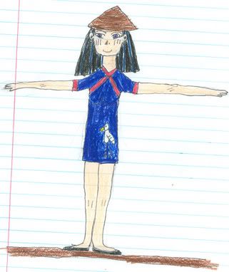 Outfit: Short dark blue Chinese-style dress with red trimming and a big white crane sewed on it, brown Japanese-style sandals, and a Japanese-style hat
