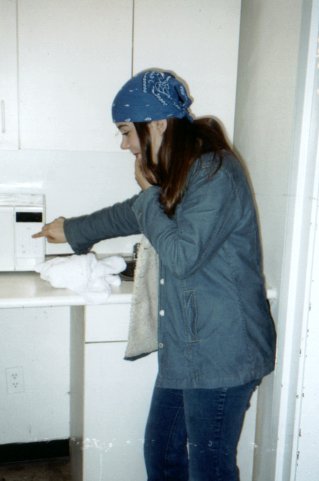 And this is our little kitchen area thing, complete with sink, microwave, and cupboards. The microwave was kinda scary though, hence my sister's weird face. ^_^;;