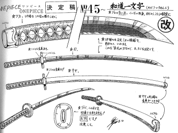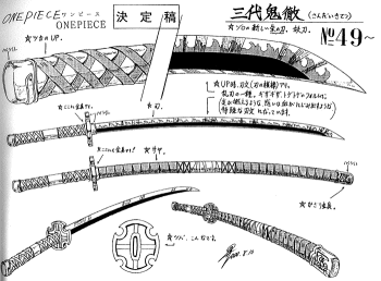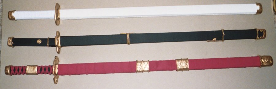 Alright, yup, here are Zoro's swords! I found the 3 diagrams on an Italian site (I think...). I do apologize for just taking their pics, but I don't remember the site. Just know that these have been resized so the original ones are much nicer. But they sure helped out a LOT! Had I not found these, Zoro would have had his first three swords (these are his second set of 3, only the white one was in the first group, the other 2 looked similar to it only black). It would have been easier, but not nearly as cool. I love the black one! I made it with the material from my Ed shirt. ^_^;; It was ruined anyway so I figured I'd put it to good use. The white one was left over material from Robin's coat, and the red one was an old long skirt my sis gave me (I don't know where she got it, actually, I never saw her wear it). They were all so HEAVY!