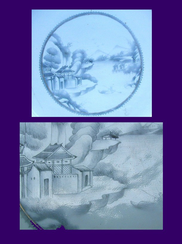 This is an exceptional Chinese export plate from the 18th century or earlier. It is a grisaille landscape of exceptionally fine detail. The thin thin lines give a furry appearance when viewed normally by eye or by lens. But a magnified view (see pic) reveals the idyllic water scene with incredible detail. Very nice form with the slightly barbed rim and the old border decorations in grey and gold. About 1.5" high x 8" rim diameter . A little gold gilt loss. And alas there is an old tight hairline to the right of the center medallion about 4" long. The line does not appear on the bottom. Also a small foot rim chip. Otherwise good condition. This is a rare period Chinese export, a real tour de force. Unique and not likely to find another. |