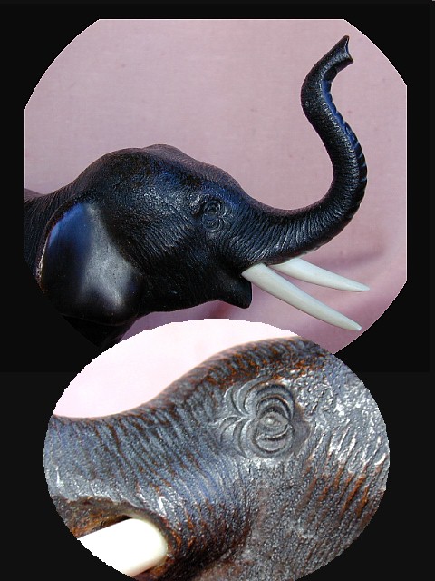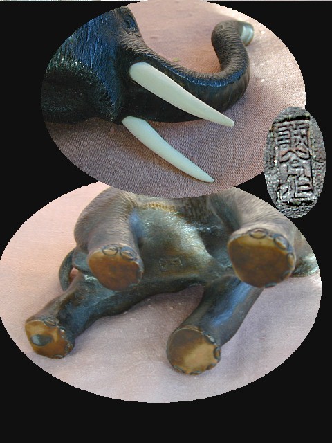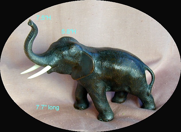 7.5" high to tip of trunk, 5.5" high to top of head; 7.7" long, a nice and versatile size. No dings or scratches, great patina, tusks not cracked or broken. This is a beauty! Nice age, Meiji arts & crafts are gaining rapidly in value. Don't miss it!