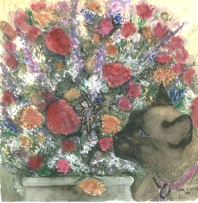 This seal point Siamese has just spied the "Flower Fairy" in a nearby bouquet and is reacting with surprise and wonder.