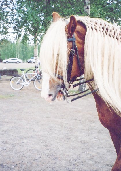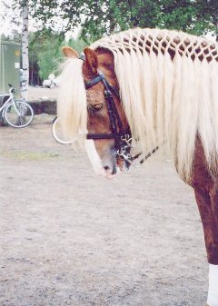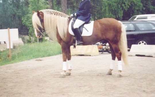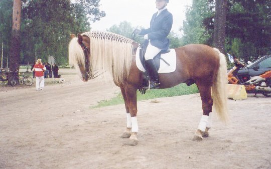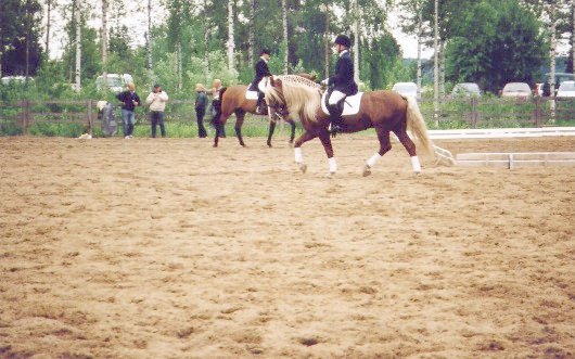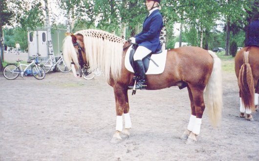 Kisoissa:Kasperi on aina yhtä innokas. Uusi ympäristö, paljon ihmisiä ja erilaiset hevoset ihmetyttää sitä ja kaikki on niin mielenkiintoista ja jännää. Se ei kyllä missään uusissa paikoissa pelkää mitään, vaan se menee siellä kuin kotonaan ja luulee tietävänsä paikat :) Verryttelyssä se saattaa luimia ja vähän varoitella muita hevosia, mutta joskus laitamme sille häntään varoitukseksi punaisen rusetin.