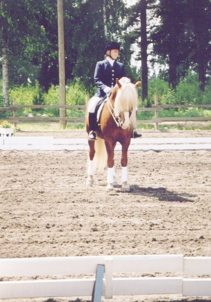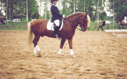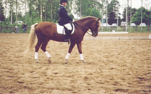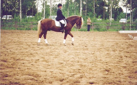 Ratsastettaessa: Ihana! Sen askeleet on todella pehmeät ja lennokkaat. Sen harjoitusravissa on todella helppo istua. Riippuu ratsastajasta, mutta oikeastaan heti kun selkään pääsee ja istuu siellä kunnolla, Kasperin pää on jo peräänannossa. Koulua se menee erinomaisesti. Panostamme siihen kaikkein eniten. Esteitä hyppää myös innokkaasti. Irtohypytyksessä tämä vonkale hypääsi 120cm. Maastoesteitä ollaan täällä omalla tallilla hypätty ja on näyttänyt siltä, että sekin voisi sopia Kasperille. Maastossa pelkää puimureita ja isoja rekkoja.