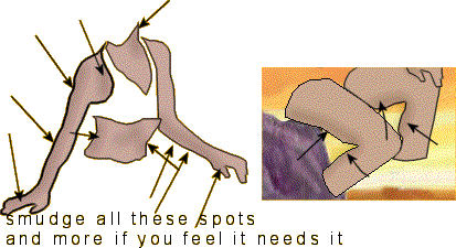 3)Add new layer....selections...load from disk...leg 1.... flood fill with #C9A790.....add new layer...flood fill black.... selections...modify...contract by 1....delete...add new layer....selections... load from disk...leg 2...flood fill #C9A790....add new layer...flood fill with black...selections...modify....contract by 1...delete.... ...Add new layer...selections...load from disk....arm 1...flood fill #C9A790... add new layer...flood fill black....selections...modify ...contact by 1...delete.....add new layer...selections...load from disk...arm 2....flood fill #C9A790...add new layer...flood fill black ...selections...modify...contract by 1...delete...add new layer...selections load from disk...neck...flood fill #C9A790...add new layer ...flood fill black...selections...modify...contract by 1...delete... add new layer...selections...load from disk tummy....flood fill #C9A790... add new layer...flood fill black...selections..modify...contract by 1...delete... layers>merge...with your smudge tool size set at 20...darken RGB...smudge.. her legs,tummy and arms layers>merge....