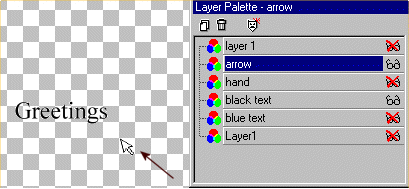 Now let's get this thing moving.....close off all layers except the arrow..duplicate the arrow and close it off.....and open the black text and duplicate....turn off this layer.....with your mover tool move the arrow down a bit to about