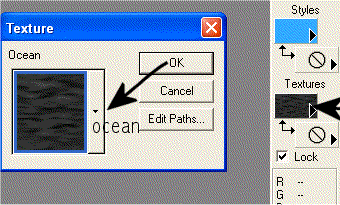 click the texture foreground....click the drop down arrow and find "ocean"....now on your new layer flood fill, you will have to flood fill about 6 times to get the right texture....with the magic wand and your text layer active... click outside the text...go to your flood fill layer and hit delete button...select none...now if you have any thing still filled with the flood fill such as "O" or "A" or "D" just click inside and delete the same as you deleted your flood fill...ok now we have it filled...layers> merge... add a new layer selections...load from alpha chanel....and click on effects...cutout...with these settings