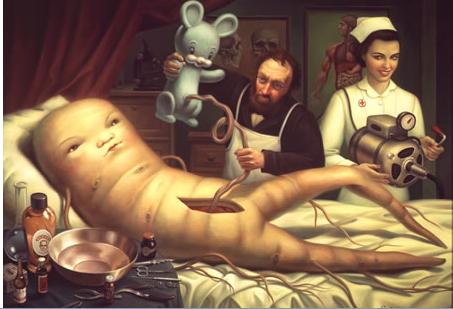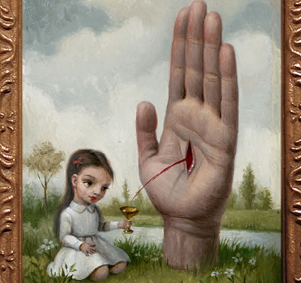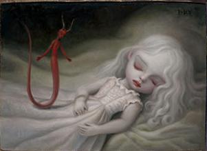 Mark Ryden is still alive; he was born in 1963 and lives in California. To sum up his work, I'll use a quote from his website: "Ryden’s work mingles superb technique with outre images to create a world of strange and disturbing beauty":