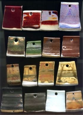 Top row, far left tile is June Perry's Raspberry Copper Red # 7009 A color on Windsor porcelain. It appears that this my be able to take a bit more heat -- C 11 starting or even a bit more.