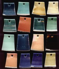 Top row 2nd tile from left is June Perry's #7096 color C . I wanted to see what I would get, using a lot of crystal forming materials. It's a very pretty matt aqua, with almost an iridescent quality. I will play with this one a bit more. I'd like to up the Silica alumina ratio a bit.