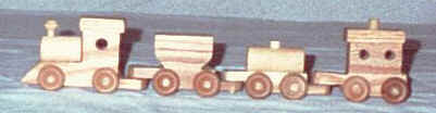 Mini trains are made from red oak, and are approximately 14 in. long.