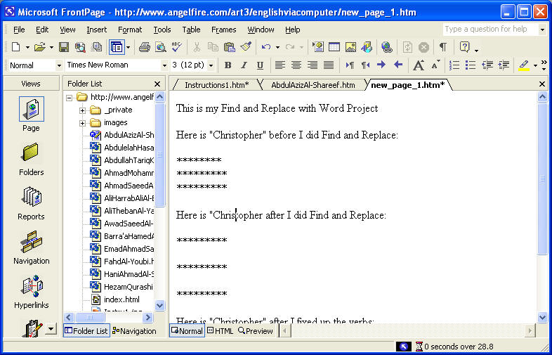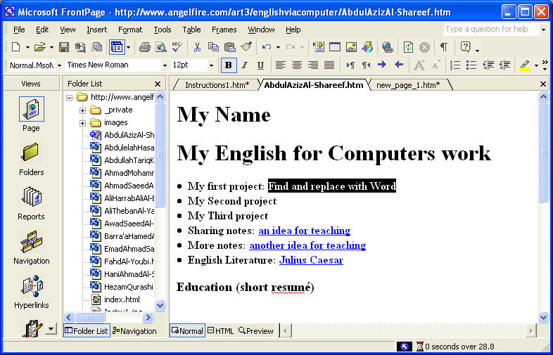 Lab work for Wednesday, December 7 and Wednesday December 14 classes to do at the internet café or at home: Putting in your name and resume in your home page at https://www.angelfire.com/art3/englishviacomputer, and pasting in your Find and Replace with Word work with “Christopher”
