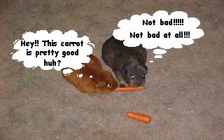 These are 4 of my cavies, all lined up in a row. From left to right are: Co-Co, Penni, Canoso, and Shakespeare. They're all enjoying a little carrot munching. They like each other's company and communicate with each other with little "Wheeeks!"