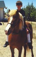 Epona is a 10 year old Icelandic mare, chestnut with flaxen mane and tail, standing about 12-3h. She is 5-gaited, but most of her time has been spent pulling a cart with her previous owner, Sarah.