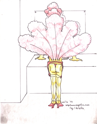 | Very Small Lower-Case x-ish Stories #2b Agents Mulder and Scully were on the way back from assisting the Royal Canadian Mounted Police in British Columbia (see previous x-ISH story #2a,) when they were ordered by their boss, Assistant Director Skinner, to make a pick-up run at Area 51. They stopped for a sleepover in Las Vegas. During the night a sinister Las Vegas ooze-The Golden Ooze-oozed in under the motel room door and attacked Mulder. It covered him. He sparkled. Like a Golden Girl. But not as dead. Yet. The slime begins to layer itself in certain areas-the groin, the nipples, the earlobes, and the feet, building itself up like coral into the beginnings of a gaudy costume. He and Scully stumble into Asst. Dir. Skinner's office, Mulder clutching his trenchcoat and hat tightly to keep the feather fans under wraps. "It was like this, Sir," begins Scully. "Agent Mulder came to my motel room to use my Magic Fingers. It was completely innocent. Then, later on... well, he was goo-ed." "Are you telling me that Agent Mulder was...good?" asks a shocked but perversely interested Asst. Dir. Skinner. He exchanges a leer with The Cigarette Smoking Man, who is hanging from a silky thread near a web in the darkest corner. "No! He was goo-ed." explains Scully. "Look!" she says, pulling off the hat and coat. A dazzling Mulder preens his tailfeathers. "There's something not quite right about the chin and mouth." says Asst. Dir. Skinner. "And the Adam's Apple is too big," The Cigarette Smoking Man adds. He is immediately put into isolation, of course. "Now, see here!" Asst. Dir. Skinner rumbles, pacing at the door to the isolation room. "Black Oil, Green Pus, Shooting, Torching, Gutting- these are all tough, masculine ways to be offed. So! these scummy aliens want to subject us to Cross-Dressing? I don't THINK so." Skinner's eyes narrow to slits. The glistening plaque has now crept into the most intimate parts of Mulder's body. Sometimes Scully has to touch Mulder in those sensitive areas. "Tee hee hee!" giggles Mulder, his laugh more effeminate with each invasive probe.