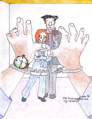 | Very Small Lower-Case x-ish Stories #1: After the Aliens removed Dana's eggs, implanted her with a microchip, gave her cancer, killed her sister and daughter, and piled on seven years of lousy Performance Reviews, they finally get it into their big bulging veiny noggins that the "stick" approach ain't workin'. Duh. Shape-Shifter Guy is assigned to approach her with the job offer of Chief Resident of "the largest Oby-Gyn clinic in this quadrant of the Galaxy." Scully takes it without giving Humanity so much as a backward look. She and Shape-Shifter soon become an on-board "item" after Scully learns that not only does he shift shape, but size as well. They marry, choosing to be Mr. and Mrs. Ward Cleaver. Dana is able, because of her position, to get some eggs back, but, as they plan their family, Dana reveals her long-cherished dream of having a nice house in the suburbs with a big yard, and taking Sunday drives in the family station wagon with a Collie named Champ. They settle on Montclair, N.J., as the place to set up a crafted semblance of housekeeping as often as their busy schedules allow. They fulfill the American dream with 4.2 children. The first two children began as one egg.The second 2.2 mass began as one egg. "Oh, admittedly, at first, little MariAnBeth is tough to get used to looking at," chirps a beaming Dana. "But, really, Ward- (casts a loving look to Shape-Shifter, who, after entering the room as Golf Pro Tiger Woods and putting his golf bag in the hall closet, composes himself,)-and I can't get enough of her! "She's!" "Swell!" chime in little "wider-than-she-is-tall" MariAnBeth's two older twin brothers, Rip and Gore, age 8, who at this moment look like Penn and Teller. "Arf!" says Champ, who just looks like a dumb dog.