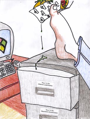 Chris Carter takes the four young adult males out and teaches them to surf. They, in turn, teach him to pick up stuff with his toes. In an "Entertainment Tonight" interview, the Work-A-Holic blurts out that with this new skill, "I don't have to stop for lunch!" (he grins as he says this, setting off a series of facial twitches (see"StarTreX" #2, next story.) (Leila's note to the readers: The file drawer labels came out very small. The labels read: Ways to Die: Ablation-Lyophilization, and, Ways To Die: Maceration-Zymoticization, ok?) |