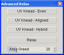 In the Advanced Relax section, set the 'Area Greed' value by dragging the tiny triangle left or right. A second way of adjusting the area greed is to click and hold with the left mouse button on the up and down arrows. Drag up or down. Setting a higher value for the 'Area Greed' flattens UVs more.