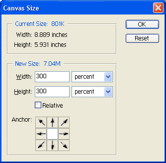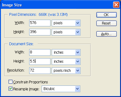 Now that I've gotten the brightness to be consistent, I still have to eliminate the line that occurs when it tiles. To do that, I'll make a rig that's specially designed to fix the problem. First, I'll change the image size so it will be an even number of inches high and wide (8" x 5.5"). This will help when I'll laying down guide lines. I turn off 'Constrain Proportions' so the image can be forced to the size I want. I make sure that I don't stretch the image too much, though.