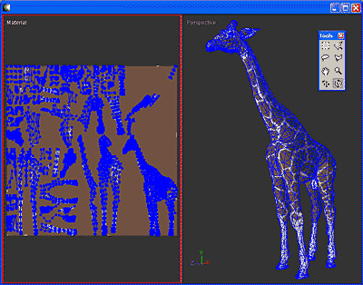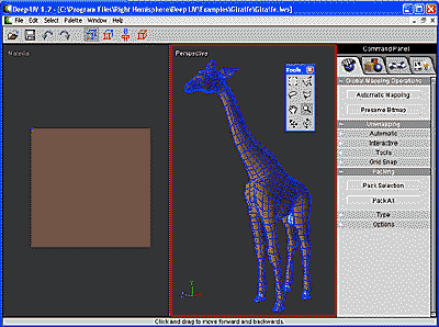 I never trust when a program says that it can load LightWave .LWO objects that it will support all features so I always save out a version which has no skelegons, no weight maps, no subsurfacing mode turned on, and simple surface names (or only one surface) when I'm experimenting. Also, I export the object in LightWave 5.6 format by doing 'File->Export->Export LightWave 5' from LightWave's Modeler, as programs generally accept version 5.6 objects better than version 7.5 objects (version 5.6 objects were less complex, supporting less capabilities). The new features have nothing to do with UV Maps, so you lose nothing by creating the UV Maps using a version 5 object. IMPORTANT - Always finish your object completely before creating UV Maps. After creating UV Maps, no new polygons should ever be added, nor should current polygons move their positions. I save it into the 'C:\Program Files\Right Hemisphere\Deep UV\Examples\' folder as 'Giraffe.lwo'. DEEPUV, USING DEEPUV Using DeepUV version 1.2.0.7, I do a 'File->Open' (CTRL-o) and load 'Giraffe.lwo'. The Material viewport will be to the left, and the Perspective on the right. The Rotate Tool is selected, so I move my mouse over that viewport, hold the left mouse button down, and drag to the left to rotate the object. I press SPACE for the 'Panning' tool, positioning the giraffe; then I use the 'Zoom' tool to size the object.