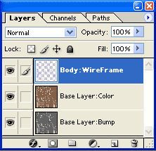 I save it using the default name 'Deep3D_Body.PSD'. I created a bump channel as well as a color channel just to show what the document looks like. When I load the exported image into Photoshop, It has created three layers: " Body: Wireframe"I delete the Bump layer by right-clicking on that layer and choosing 'Delete Layer' because I didn't need that channel anyways, then turn off the visibility on the 'Body: WireFrame' layer by un-choosing the eye symbol to the left of that layer's name.