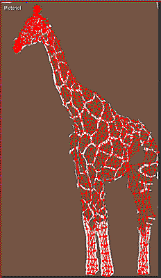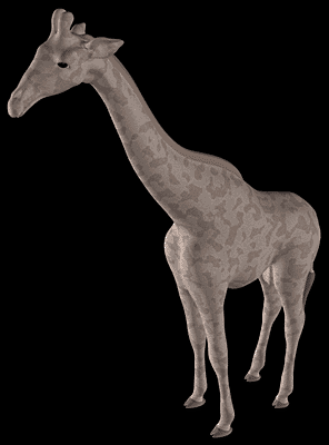 If you look at the side-view, you'll see that I got the head from one image, the tail from another and the legs from yet another. I use Photoshop's 'Scale', 'Rotate', 'Skew', 'Distort' and 'Perspective' tools to size, rotate and position each part until they all feel like they integrate with each other, and are a true side-image with no distortions. The front view is more difficult to assemble in such a manner because people rarely take photos of a giraffe from the front. And, the back view is impossible to find. I find a back 3/4 view and using the outline from the front view, I fake a back view using my imagination and stolen images of the front of the legs. Again, it doesn't have to be perfect, it just needs to be correct enough that you can create a 3D object from the images. I've, many times, already shown you how organic 3D objects are created, so will jump right into the use of DeepUV to generate UV Maps for the giraffe, and the integration with DeepPaint 3D to paint the giraffe's hide. Since there are no tutorials out there telling how to use DeepUV with LightWave objects, this will not be a perfect methods, but at least the methods work (with bugs). I'm sure there are better ways to do this, but until people experiment more with the programs, this will have to do. Here's a LightWave Scene rendering of the giraffe with a fake procedural texture to temporarily simulate spots.