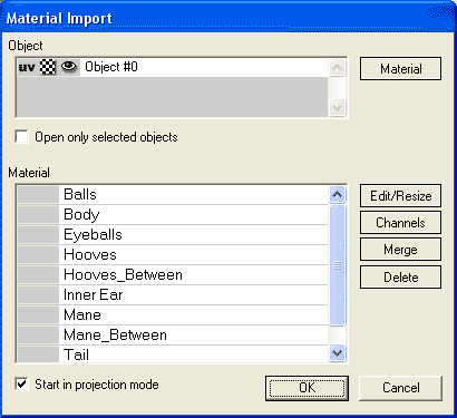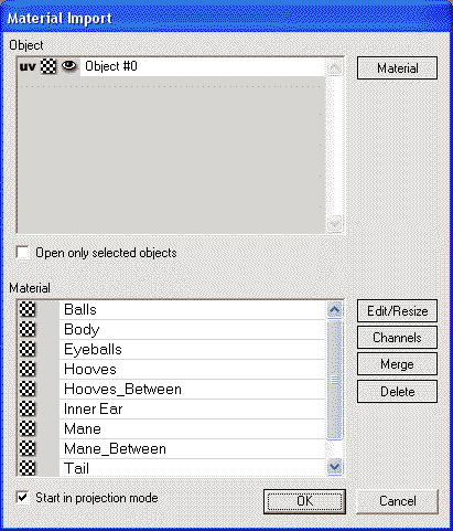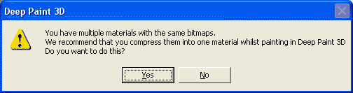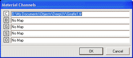If any of the materials don't have a checkerboard next to them it probably means that you didn't create a 'New Blank Map' for the color channel of that material. Click 'OK' to have it complete everything. If, after it completes, your object doesn't have the colors it should have, return to DeepUV and choose 'File->Export->Send Texture Update'. This will fill the material maps with the colors as defined by the object in DeepUV. When you switch to Deep Paint 3D, a new requester will have appeared.