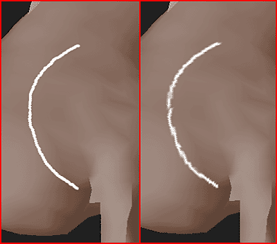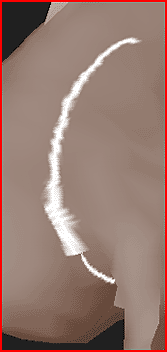 I select Photoshop's 'Clone' tool ![]() From the brush drop-down I select a wide brush size, select 100% for both the Opacity and Flow, then point to an area of brown hide while holding down the ALT key. I click so it will remember that area as the area to clone. I move to a white stripe and click, dragging the cloned image as I paint each white line with hide. Sometimes, particularly if you've picked a too-large brush size, a ghost line will appear along the cloned line you paint.