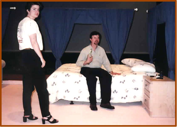 Director Jim Barnard drains whiskey bottle, collapses on the bed and then directs Master Thespian to put his camera away. Oops! Too late the flash went off! Standing is Ashley Barnard. They may