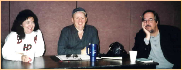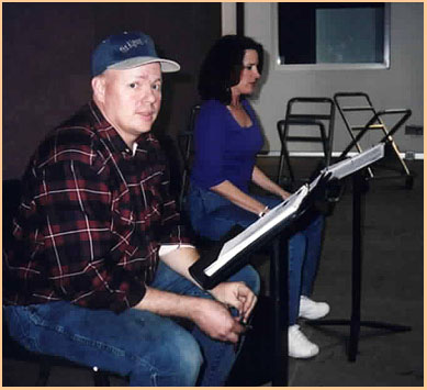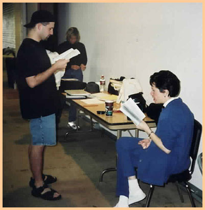 Melodie Duncan, Gary Vos, and Tom Rees pose for a quick pic. Melodie is the Assistant Director and Gary Vos is the Stage Manager and has at one time or another stood in for virtually every character (except me, cause I'm always there, well not having a job helps, and because I feel if you can't show up for rehearsal sick, will you show up for the performance sick?) The massive Tom Rees plays G-Man #1, and savors yelling at Mr.Kirby.