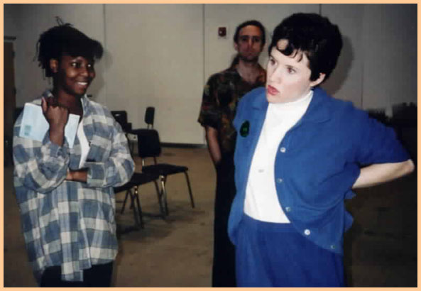 Kerry & Jason listen intently as someone explains something to them. Jason Barth plays 'Ed' the husband of 'Essie'. In the background we see Brian Hurley airing out his pits.