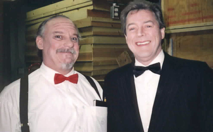 Gremio (Robert Strupp) poses in the carpentry room off stage with Baptista (Lyman Akers.) Your Master Thespian was promised the part of Baptista months prior, but Lyman did such a good job in my stead I'm glad he was Baptista. |