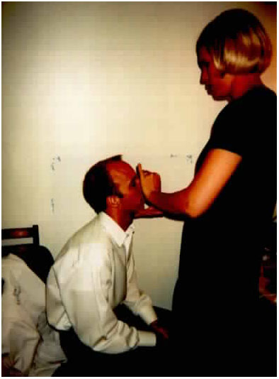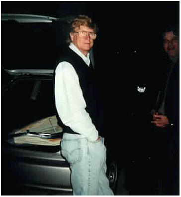 Jim Sovaca, Renee, Allison and Jenny practice singing that old favorite, "Harvest Home." This tune was bellowed offstage prior to the "Thanksgiving with Mom (Old Lady)" scene. As "Stuart," Master Thespian was scheduled to begin the serenade of "Mom" with the song "Aura Lee" (sung to the Elvis oldie of "Love Me Tender.") However, your Master Thespian got a case of the giggles during rehearsal and Jason (as "Fred", who can sing) was assigned the starting spot. Audience reports were that this serenade was a very touching moment.