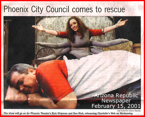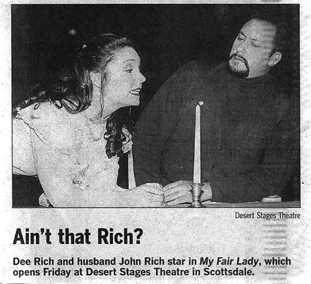 2/20/01: Now, Dee and John Rich make the entertainment pages of the Arizona Republic! When the hell is your Master Thespian's photo see print?! (Grin) Dee and John open in My Fair Lady, this Friday February 23rd, 2001 at Desert Stages Theatre in Scottsdale. |